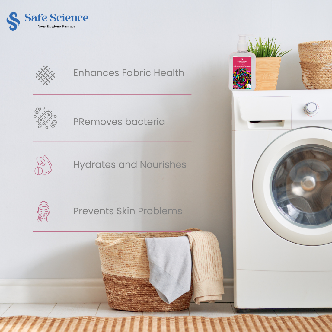 Safe Science Intimate Detergent Liquid is specially crafted using eco-friendly certified raw materials to ensure safety for both skin and the planet. Designed with a pH-neutral formula, it protects delicate fabrics while maintaining their natural texture and softness. Its gentle yet effective cleansing action removes impurities without causing damage or fading, making it ideal for intimate wear and fine textiles. The formulation enhances fabric longevity, reducing wear and tear over time. Completely free from parabens, sulfates, phthalates, LAPSA, and harsh chemicals, it offers a sustainable cleaning solution that respects your garments and the environment, combining performance, fabric care, and eco-conscious living in one trusted product. The detergent liquid comes with a Fragrance Free Formula and is attached with a Fabric Freshner with a Himalayan Green Apple Fragrance.